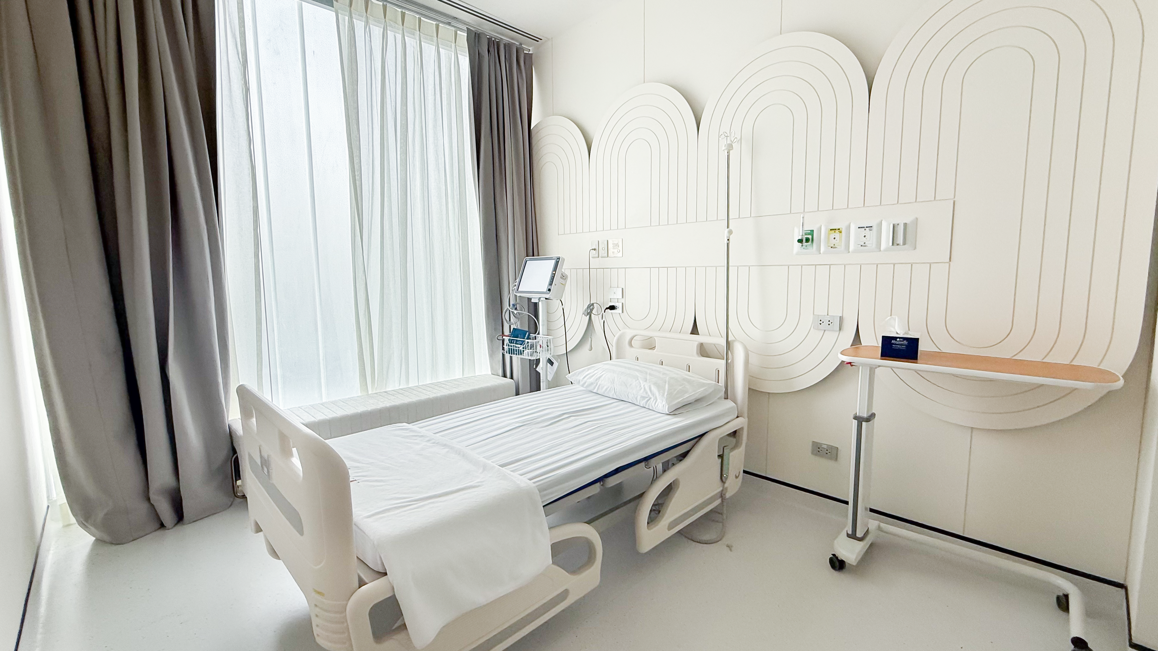 ห้องพักผู้ป่วยของเราได้รับการออกแบบภายใต้แนวคิด Healing Environment ที่ผสานความเรียบหรูและความสบายเข้าไว้ด้วยกัน ผนังบุวัสดุซับเสียงโทนสีครีมอ่อนโอบล้อมบรรยากาศให้นุ่มนวลและสงบ ขณะที่ไฟ LED แสงอบอุ่นช่วยลดความล้าของสายตาและสร้างความผ่อนคลายตลอดการพักฟื้น เตียงผู้ป่วยระบบไฟฟ้ามาตรฐานสากลสามารถปรับระดับได้หลายทิศทาง รองรับทั้งการทำหัตถการและการปรับท่านอนเพื่อลดแรงกดทับ พร้อมราวกั้นที่แข็งแรงและปุ่มควบคุมใช้งานง่าย