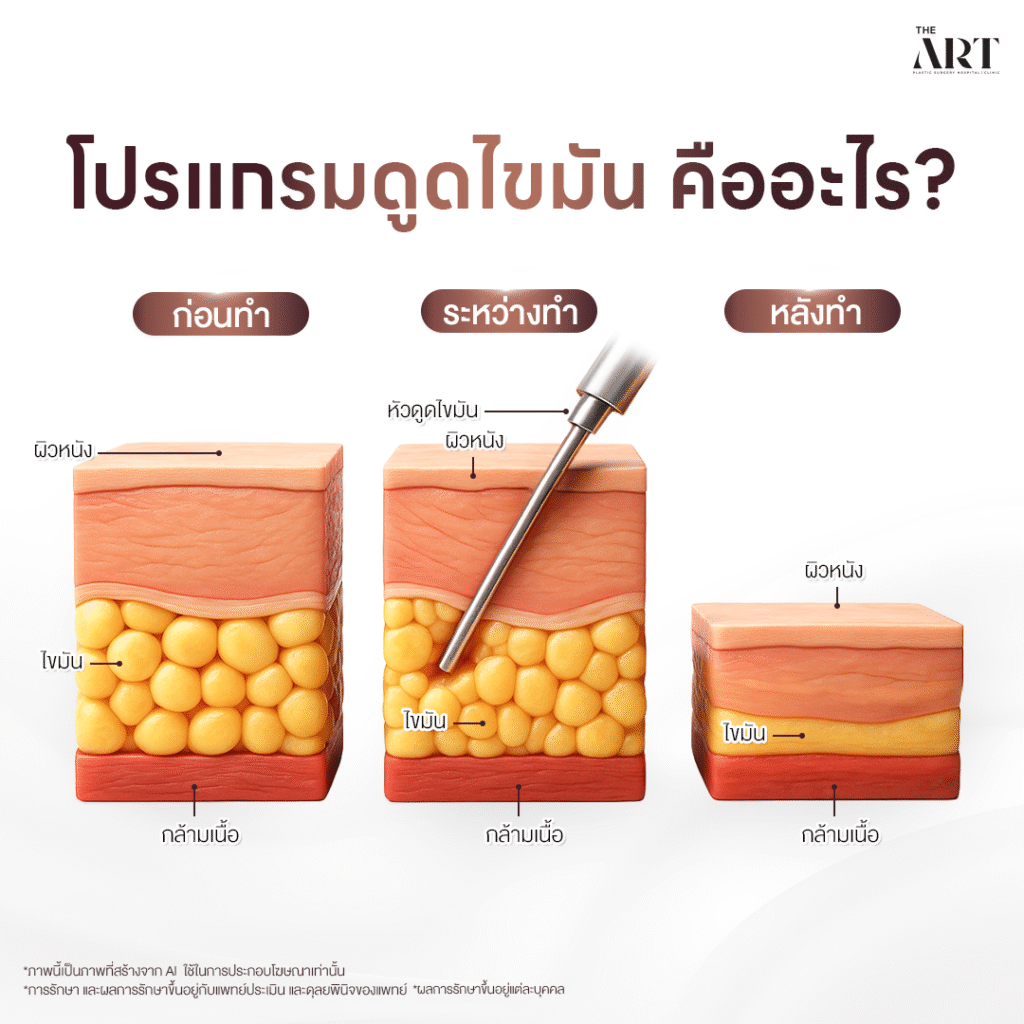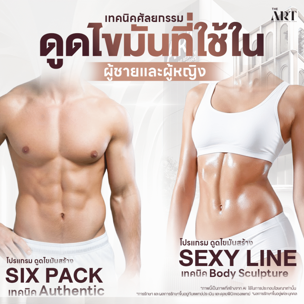 The Art Hospital ให้บริการโปรแกรมดูดไขมันทั้งผู้ชายและผู้หญิงภายใต้แนวทางทางการแพทย์ ห้องผ่าตัดปลอดเชื้อ พร้อมทีมแพทย์ออกแบบรูปร่างให้เหมาะกับโครงสร้างและสรีระของแต่ละบุคคล เน้นเทคนิค Authentic (ชาย: กล้ามชัด) และ Body Sculpture (หญิง: hourglass) ภายใต้แนวคิด “Rebalance & Natural Shape” เพื่อผลลัพธ์สมส่วน ปลอดภัย และยั่งยืน