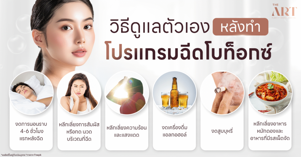 หลังทำโปรแกรมฉีดโบท็อกซ์ ควรปฏิบัติตัวอย่างเหมาะสม เพื่อให้ตัวยาเซ็ตตัวได้ดี และลดความเสี่ยงของอาการข้างเคียง โดยมีวิธีดูแลตัวเองและข้อห้ามหลังฉีด ดังนี้